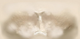 We then photographed several dry skulls and placed the photographs over this image. This composite was then painted in Photoshop™ (Version 7.0Adobe) to produce a lighter map that would look more like a living skull (Figure 12). Important landmarks like the sutures between the nasal bones were emphasized.