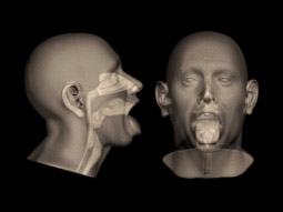 Conclusions It is necessary to have a wide range of techniques available in order to create an anatomical model that has so many complicated and interlocking parts. Each anatomical structure demanded a different approach depending on its size and complexity. Thus, the small, complex, and difficult-to-scan cartilages of the nose were more easily dealt with by initially sculpting them at 10X life size, which allowed their shapes to be created with great accuracy. Using CT data as the basis for the model of the skull allowed the rapid creation of a detailed and anatomically accurate model, which could then be revised digitally. The vomer, perpendicular plate of ethmoid, maxilloturbinals, periosteum and perichondrium were all structures that needed to fit closely together and to the contours of the existing head model, skull and cartilages. These were best created entirely digitally, using the main components of the model- the skull, cartilages, and head model- as guides. The use of software such as Mimics™ and Geomagic Studio™ to alter the original data was invaluable. This software allowed us to tweak the model in order to emphasize the areas of anatomical interest and of reducing the detail in areas that were not germane to the purpose of the model. This also allowed us to reduce the size of the model so that it could be manipulated within the virtual reality interface. The fact that the data came from various sources was problematic only in the instance of matching the skull from the Visible Human Project to the head model that had been previously created by Ray Evenhouse. This created some difficulties because the skull had to then be fitted to the head, instead of reconstructing a plausible face over the skull. In instances where the models to be created are not fit into a previously existing format, it would be preferable to begin with the CT data and model the rest of the structures to fit. Sculpting and digitally modeling the cartilages and additional structures to fit the skull and head were not a problem. Using combinations of traditional sculpting, information derived from segmented CT data, and digital modeling techniques, we were able to produce a useful set of digital models as seen in Table 1. These models were then refined and combined in digital modeling programs that resulted in a compatible set of digital models suitable for a virtual reality interface. These models can be viewed as a Quicktime movie on the electronic version. They can also be viewed as VRML files using the Cortona viewer, downloadable at http://www.parallelgraphics.com/products/cortona/.