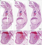 Introduction Since 1998, our department has used Imacon Flextight scanners to digitally capture a variety of media, including black-and-white and color positives and negatives in film formats, from 35 mm through 4x5. The scanner’s ease of use, speed, resolution, and 14-bit image capture were all factors in selecting the Precision II, and subsequently replacing it in 2005 with the 949 (16-bit color with auto focus). Another important scanner characteristic is dynamic range—the ability to capture detail in the darkest darks to the lightest lights without clipping data in any of the channels. Many scanners boast high Dmax values, but are unable to deliver when presented with a challenging subject. Imacon scanners are Macintosh and PC compatible, and include the manufacturer’s FlexColor software. The Flextight scanners are marketed as CCD drum scanners because they use a charged coupled device (CCD) for imaging, and they wrap the original around a “drum” to ensure the film lays flat at the optical line of sight (highlighted in yellow in Figure 1). This glassless technology yields a digital capture comparable to costly drum scanners without mounting the original to an acrylic drum, application of gel, or hiring specially trained staff to operate the unit. Since there are no additional media in the optical path, the Flextight method avoids the formation of Newton rings, an interference pattern of concentric rings that can occur with both drum and flatbed scanners. These often appear in the scanned image when pockets of air become trapped between the scanned item and the scanner’s smooth surface and are more likely to happen during periods of higher humidity. The system was, however, initially incompatible with rigid material, such as mounted transparencies or glass histology slides. Once Imacon released an accessory product to scan mounted slides, we were able to harness the optical capabilities of this professional-grade scanner for histopathology. Low Power Photomicrography Optical light microscopes are optimized to resolve subcellular detail within a tissue specimen at high magnification. When these instruments are used at low magnifications, however, the photomicroscopist faces a daunting task due to a number of technical/optical limitations inherent in the instrument. For example, it is hard to maintain even illumination throughout the field of view, and young eyes frequently have difficulty achieving proper focus (Vetter 1988). Corner-to-corner focus is difficult to achieve, and spherical lens aberration is common at the periphery (Burns 1997). Large specimens, such as newborn mice or older mouse embryos, are typically photographed in sections and spliced together as a montage. This process is time consuming and can result in a composite image with missing tissue and irregular margins (Figure 2A). Automated systems that tile a series of high power images are available, but these are expensive, time consuming to operate, and bring with them additional technical issues such as two dimensional optical aberrations (Aperio, online). Similarly, various photographic apparatus, such as slide duplicators, copy stands with light boxes, and macro stands, have been used to produce low power images, but, again, with relatively poor results, due to errors including soft focus, hot spots, and bad color balance (Montague et al. 1995). Given the proliferation of digital capture devices and that the 35 mm film format is similar in width to the typical 1x3 inch glass slide, it follows that there should be a simple means to capture these specimens directly—with the histologic specimen acting as the “emulsion” residing on a glass plate medium. Two methods have been mentioned in the literature: using a flatbed scanner (Groneberg and Peiser 2002) and using a film scanner designed to accommodate 35 mm film (Azumi 1998). Initial attempts to scan histologic specimens using a variety of desktop flatbed scanners failed to produce images suitable for display or publication because of limited optical resolution, low dynamic range, and poor image sharpness (Figure 2B)—despite the flatbed manufacturers’ promotion of their device’s film scanning capabilities! Another drawback of the flatbed scanner is the optical path itself, which includes mirrors and both sides of the glass; all of these surfaces create the potential to introduce artifacts into the image, such as streaks, smudges, and dust. Furthermore, as discussed earlier, the glass-to-glass contact between the specimen cover slip and the scanner’s glass surface can cause the appearance of Newton rings, which are difficult to avoid and significantly degrade the quality of the captured image. Using a digital scanner designed for film is preferable to the flatbed scanner, and several units were evaluated before selecting the Imacon Flextight Precision II. Both consumer- and “prosumer”-grade film scanners have improved significantly over the years and offer superior dynamic range and sharpness over flatbed scanners and are competitively priced. Clearly, most film scanners today are capable of reproducing well exposed film and may be able to capture a well stained specimen slide (Gebert et al. 1998). A subject with either a very low or very high range of tonal values presents a particular challenge for any capture method. Since the structures of some histologic specimens can be darkly stained while others are barely stained at all, the dynamic range (Dmin to Dmax) of a scanner becomes the most critical characteristic when evaluating its effectiveness. My more challenging test specimens exceeded the dynamic range of all of the scanners examined except the Flextight. The method described here uses the Flextight film scanner to overcome the limitations of the traditional and alternative methods described above, and provides a high quality product that captures the original specimen both faithfully and efficiently (Figure 2C). Holder Design, Fa