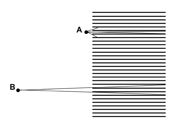 | Figure 3. Ray tracing of how a point in space at position A only reflects light that is freely transmitted by a single optical tube, whilst a point in space at position B is freely transmitted by an increasing number of optical tubes. In a 2 dimensional optical array the number of optical units that transmit light from a given point in space increases as a polynomial series where N (Number tubes viewing point in space) = 3x2 +3x + 1, where x is distance of point from the mechano-optical device. |
